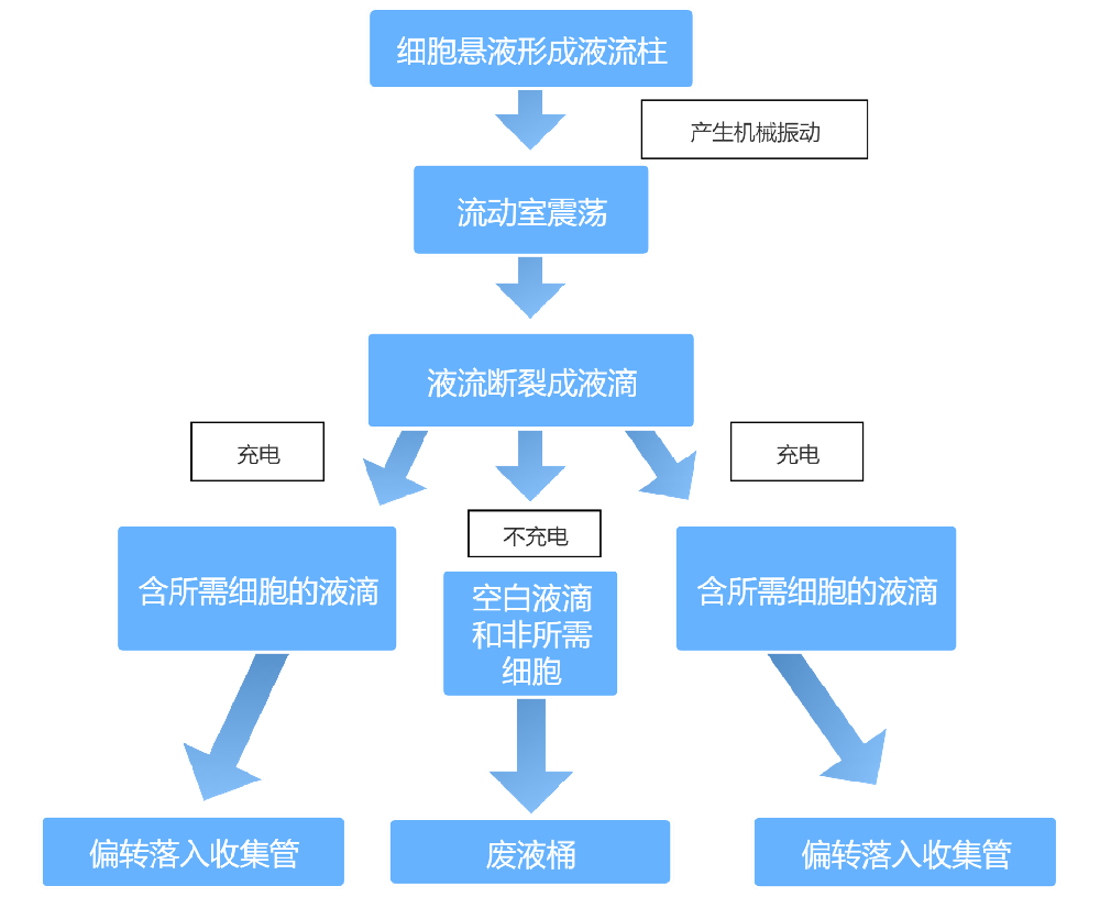 流式细胞仪使悬浮在液体中分散的经荧光标记的细胞或微粒逐个通过样品池,同时由荧光探测器捕获荧光信号并转换成分别代表前向散射角、侧向散射角和不同荧光强度的电脉冲信号,经计算机处理形成相应的点图,直方图和加三维结构图像进行分析。用于FCM的样本是单细胞悬液,可以是血液、悬浮细胞培养液、各种体液、新鲜实体瘤的单细胞悬液以及石蜡包埋组织的单细胞悬液等。